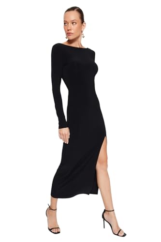 Trendyol - فستان طويل TWOAW24EL00824 ضيق مرن منسوج بفتحة جانبية ورقبة دائرية بدون ظهر للنساء من ترينديول، لون أسود