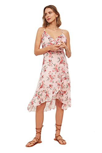 Trendyol - فستان نسائي منسوج مبطن TWOSS19EL0375 من الشيفون بحمالات وتفاصيل كشكشة وصدرية مزدوجة مع طبعة زهور من ترينديول، وردي (Powder)