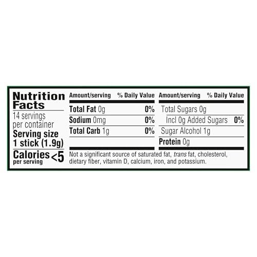 - سعرات حرارية منخفضة: 5 سعرات حرارية فقط لكل قطعة، مع 0 جرام من الدهون الإجمالية و0 جرام سكر و0 ملغ صوديوم، مما يجعله خيارًا خاليًا من الشعور بالذنب لنفس منعش.