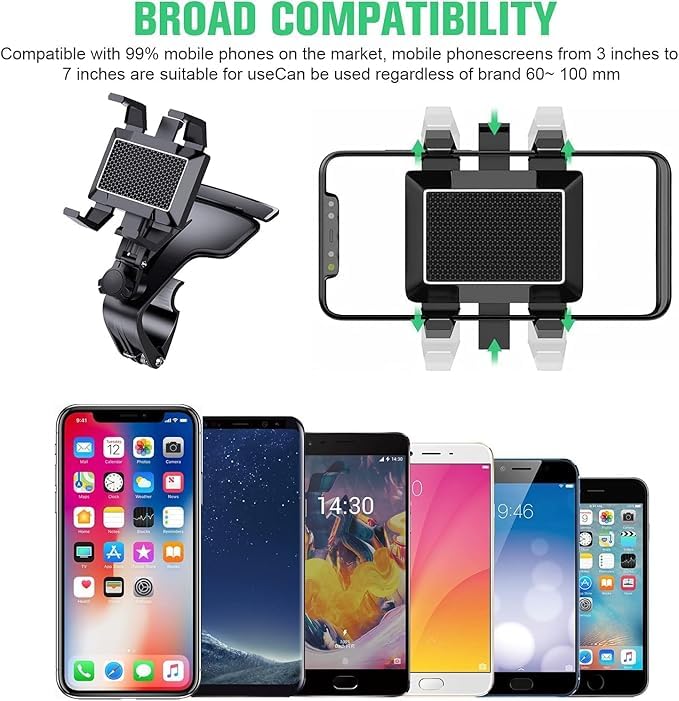 - توافق عالمي: تم تصميم حامل موبايل السيارة بتوافق الواسع مع مشبك زنبركي يمكن تعديله ليناسب جميع الموبايلات من 4 -7 بوصة. متوافق مع جميع الهواتف الموبايلات وأجهزة اخرى . انتبه: الجزء الثابت من لوحة العدادات يتطلب سماكة أقل من 5 سم/2 بوصة.