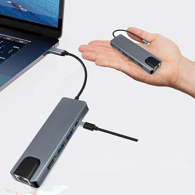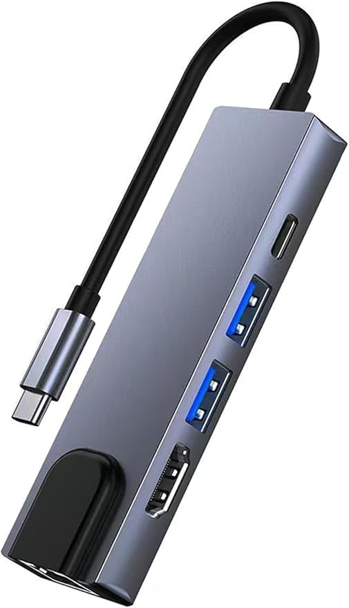 - المنافذ المضمنة (5 في 1): * LAN: منفذ إيثرنت (للشبكة السلكية)، ويدعم سرعات 100M/1000M. * Type-C: منفذ Type-C واحد (منفذ PD Power Delivery لشحن الجهاز). * USB*2: منفذين USB . * HDTV: منفذ HDMI لتوصيل شاشة عرض. * ميزات إضافية/تفاصيل: * HDTV 4K: يدعم دقة 4K عبر منفذ HDMI. * الاستخدام الرئيسي: توصيل جهاز الكمبيوتر الخاص بك المزود بمنفذ USB-C بشاشة عرض مزودة بمنفذ HDTV. باختصار، هذا المحول يوفر لك 5 وظائف أساسية في جهاز واحد، مما يجعله حلًا عمليًا لتوسيع إمكانيات أجهزة الكمبيوتر المحمولة المزودة بمنفذ USB-C، خاصة لأولئك الذين يحتاجون إلى اتصال شبكة سلكية، ومنفذ HDMI، ومنافذ USB إضافية