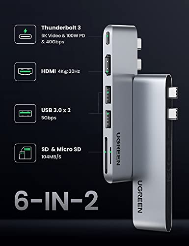 UGREEN - موزع USB C لماك بوك برو 2023 6 في 2، محول موزع بمنفذ HDMI 4K ومنفذ ثاندربولت 3 من يوجرين، ومنفذ USB-C، وقارئ بطاقات SD TF و2 USB 3.0 USB متوافق مع ماك بوك برو/اير M1 وM2 وM2 برو وM2 ماكس 2020-2023