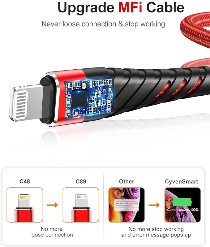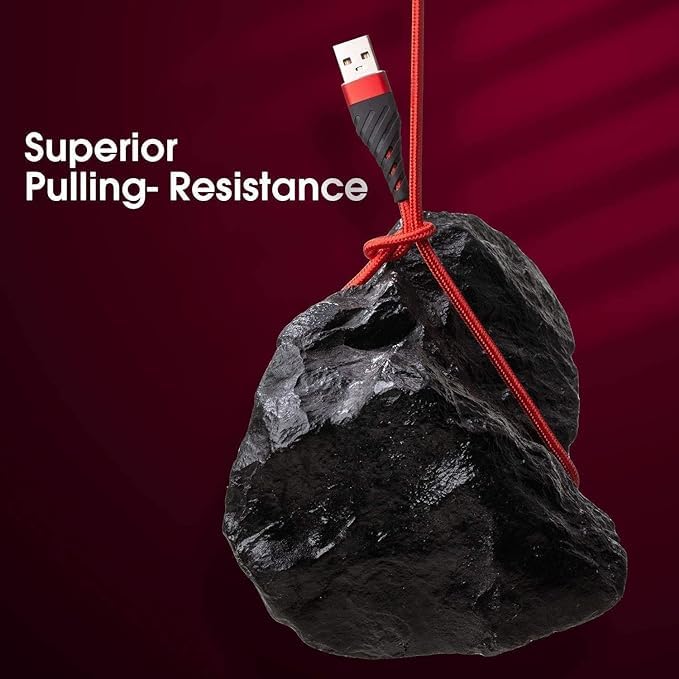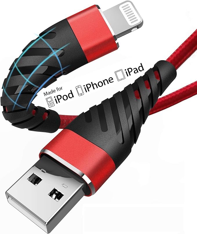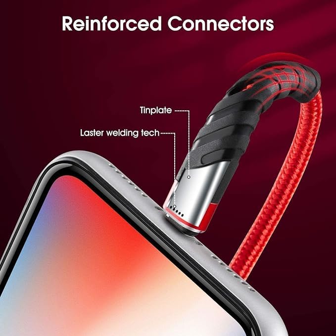 - كابل شاحن ايفون مضفر بالنايلون بطول 2 متر مع تصميم مفصل معزز، تم اختبار الكابلات للانحناء 95 درجة 10000 مرة، ويمكن أن يتحمل الانحناء والسحب المتكرر دون كسر