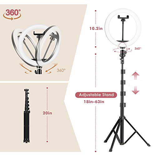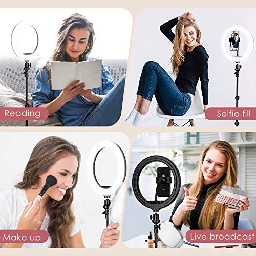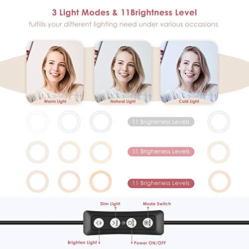 - [مصباح حلقي LED قابل للتعتيم] تم تجهيز مصباح LED الحلقي بـ 120 مصباح LED اس ام دي عالي الجودة و3 أوضاع إضاءة مختلفة (الضوء الأبيض والضوء الطبيعي والضوء الدافئ)، ساطع بما يكفي لتجميل وجهك. يحتوي كل وضع إضاءة على 10 مستويات سطوع قابلة للتعديل لتلبية جميع احتياجاتك في المناسبات المختلفة. يوفر لك الإضاءة النهارية المثالية القابلة للتعتيم للتخلص من جميع الظلال غير المرغوب بها.