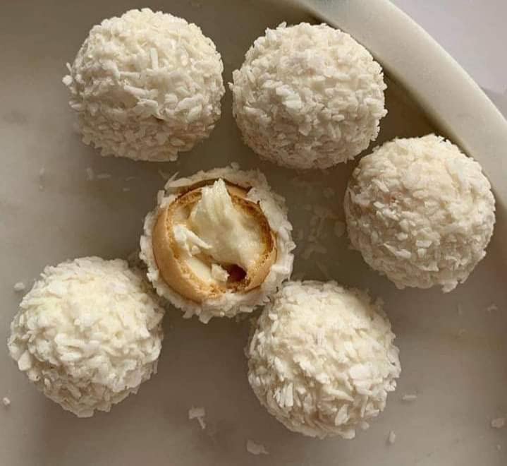 - مجموعة فاخرة من قطع الشوكولاتة التروفل البيضاء باللوز وجوز الهند.