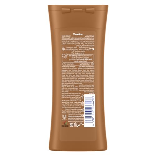 - لوشن الجسم بالكاكاو من فازلين مصنوع من زبدة الكاكاو النقية، والمعروفة بمنح البشرة إشراقة طبيعية.