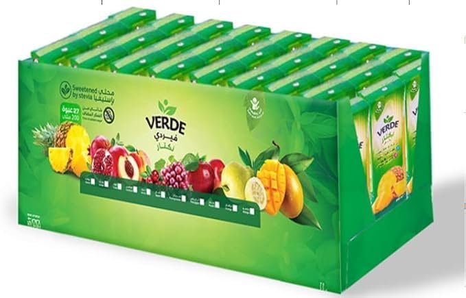 - محتويات العبوة: تحتوي على 27 قطعة من مشروب الأناناس فيردي نكتار في عبوة كرتونية مريحة للتخزين والتوزيع بالجملة