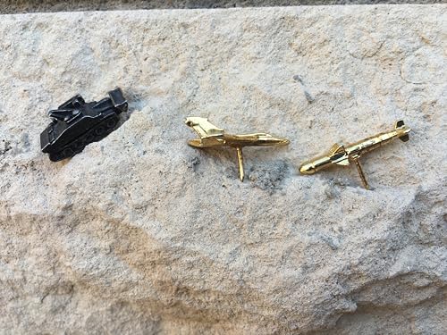 - مجموعة كلاسيكية من شارات طية صدر السترة على شكل دبابة وطائرة وغواصة. صنعت في انجلترا.