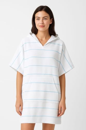 Generic - بونشو بحر أبيض بخطوط تركوازيه رائعه للبالغين من الجنسين مصنوع من خامات طبيعيه 100% - من تصميم زهره هوم
