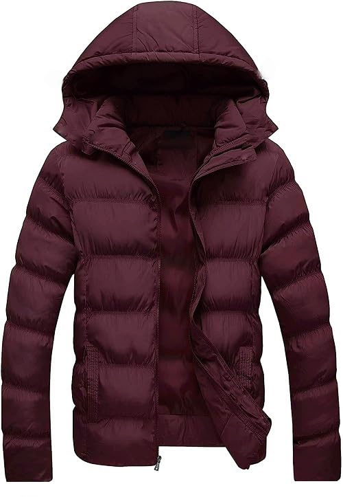Generic - جاكيت مبطن للشتاء باكمام طويلة منفوخة وسوستة مع غطاء رأس قابل للازالة احمر داكن L ، للنساء