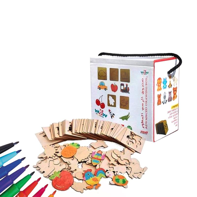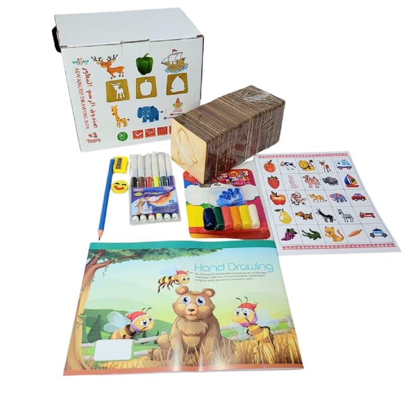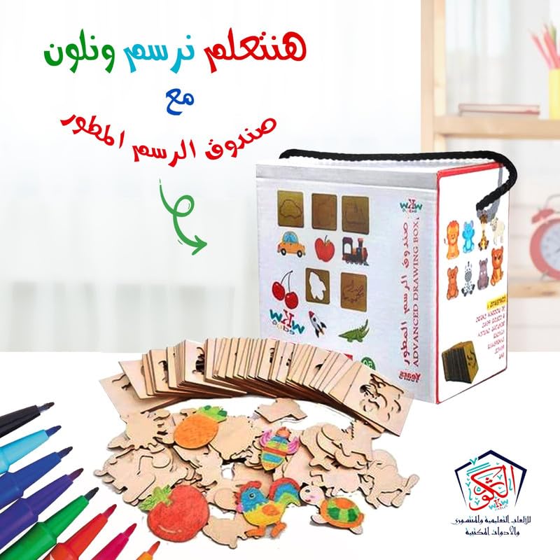 • يتكون من 50 قطعه خشبيه قابله للتفريغ - قلم رصاص - استيكه - برايه - اسكتش ص - الوان فلوماستر - كتالوج