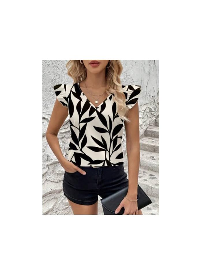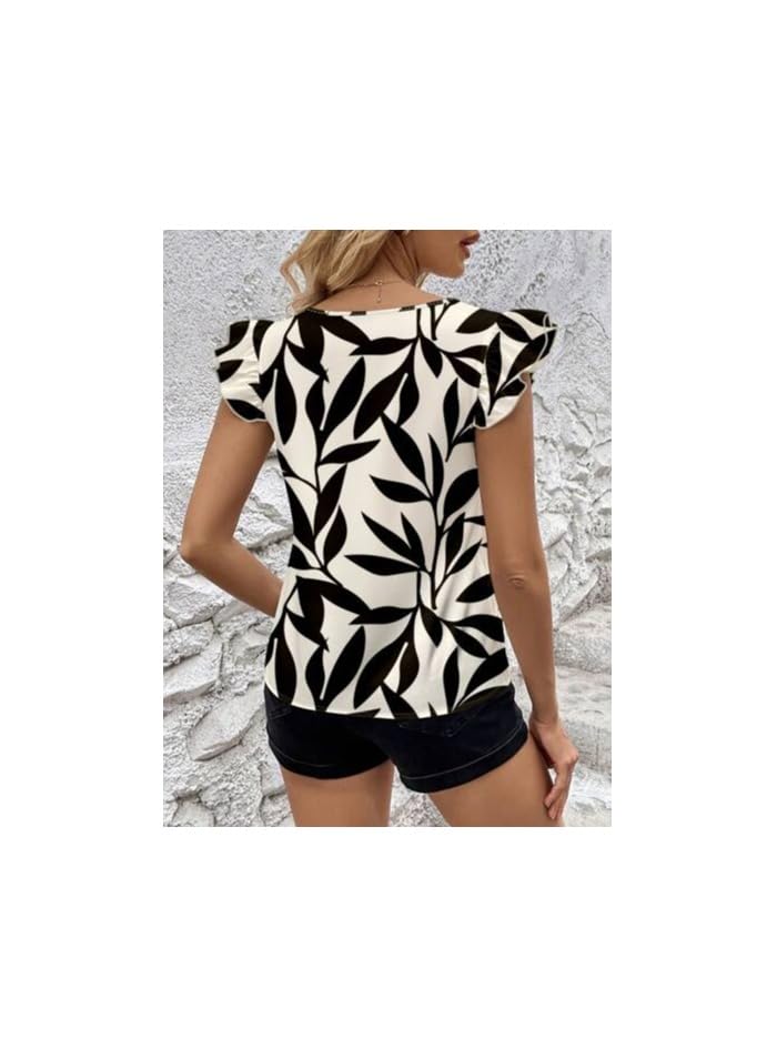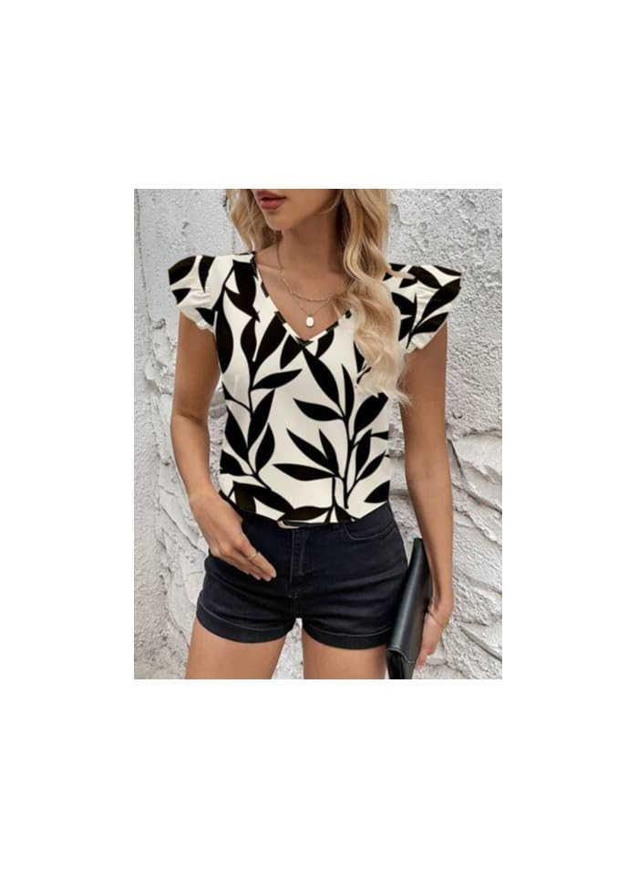 Generic - بلوزة نسائية كلاسيكية مطبوعة بنقشة نباتات بأكمام قصيرة منسدلة
