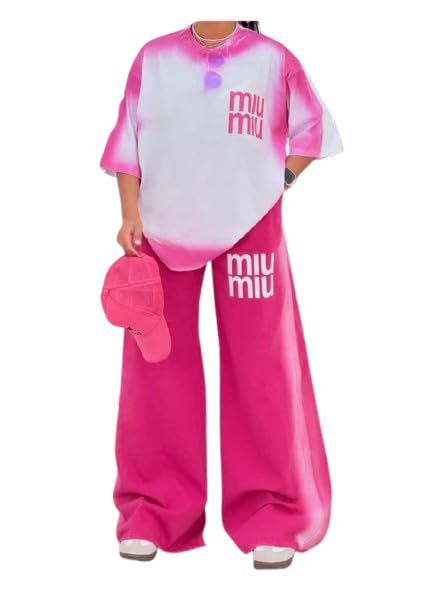 Generic - طقم نسائي رياضي مكون من قطعتين، قطن، تاي داي وردي وأبيض، بنطلون واسع