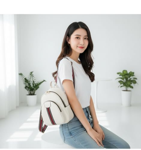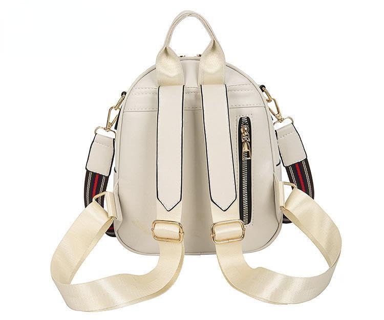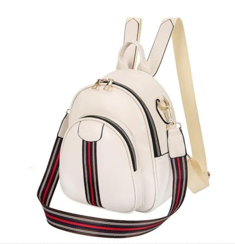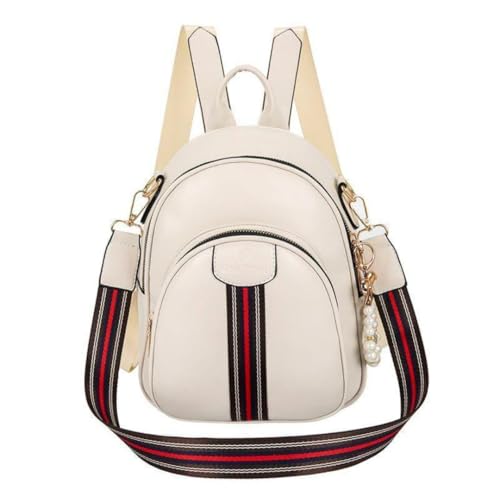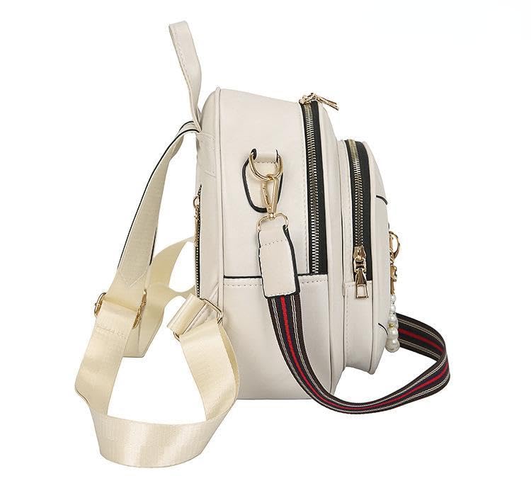 Generic - حقيبة ظهر نسائية ، لون ابيض ، بحزام كتف مخطط أحمر وأسود، مع إكسسوار لؤلؤ