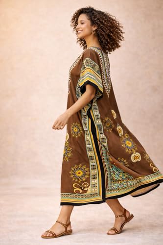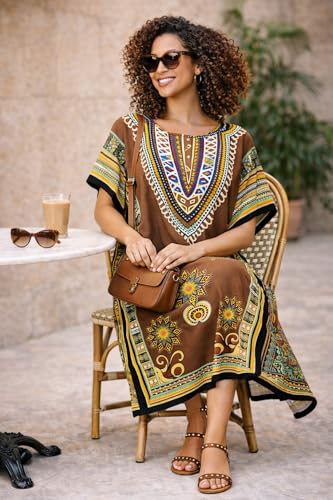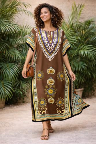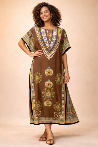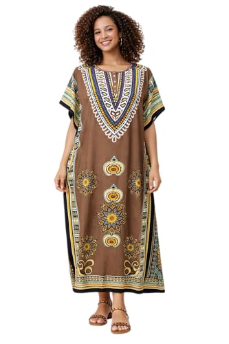 Generic - فستان ماكسي قفطان داشيكي للنساء، بني، طباعة افريقية تقليدية، كم قصير، قصة فضفاضة، نمط بوهيمي