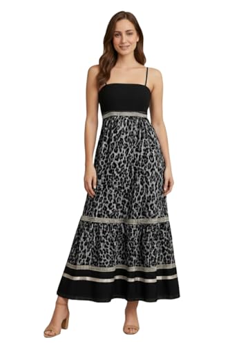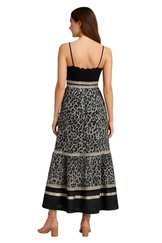 Generic - فستان ماكسي بطبعة جلد الفهد للنساء، اسود ورمادي، حزام سباغيتي، خصر امبراطوري، تفاصيل حواف معدنية، تصميم تنورة بطبقات. مقاس XL