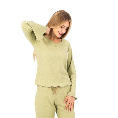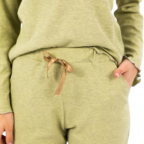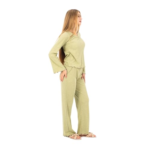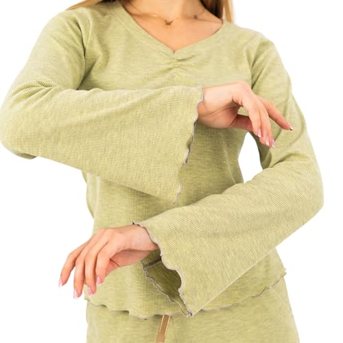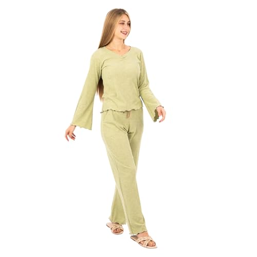 ZECOTEX - طقم بيجامة عصري من القطن المضلع للنساء، بلوزة بأكمام طويلة وبنطلون بأرجل واسعة، ملابس منزلية صيفية خفيفة الوزن
