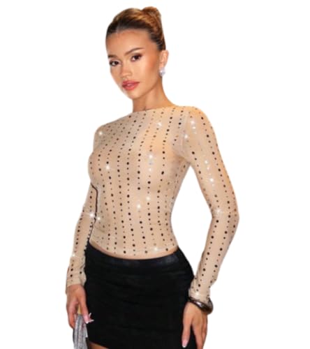 Generic - بلوزة نسائية لامعة منقطة باكمام طويلة، شبكة بيج مع ترتر، ملابس مناسبة للحفلات