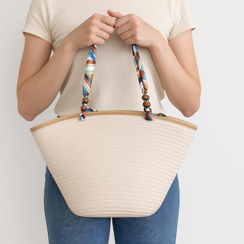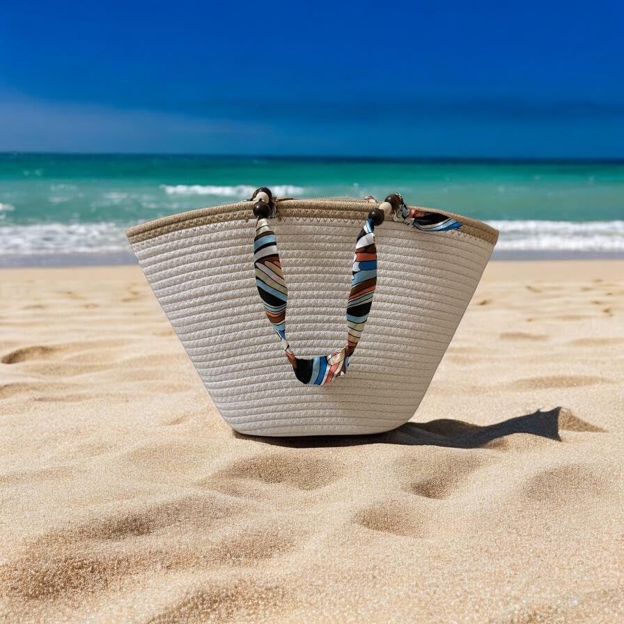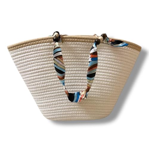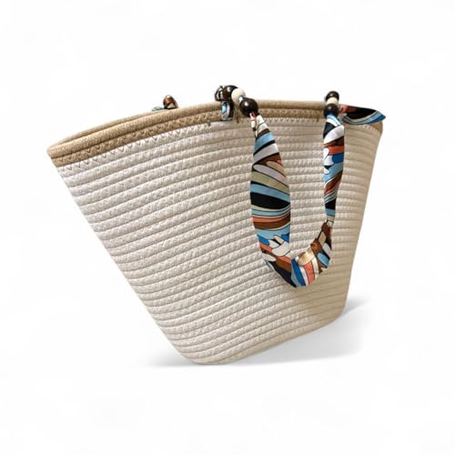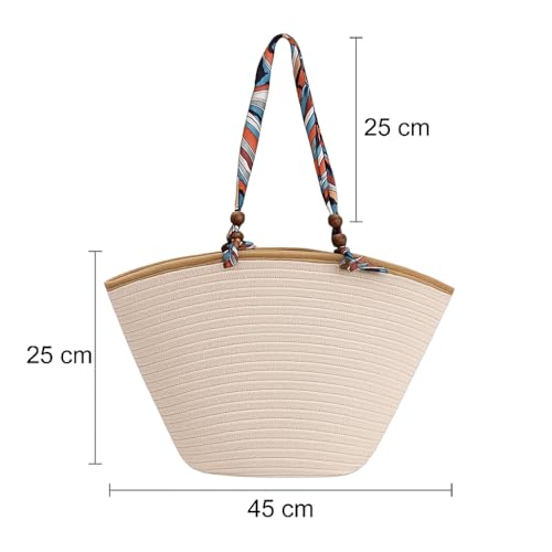 Generic - شنطة يد كبيرة توت من القش مع مقابض وشاح ملونة للنساء - شنطة شاطئ صيفية منسوجة بسعة كبيرة للسفر والنزهات والتسوق