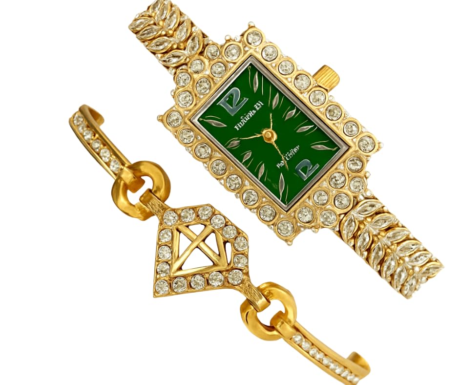 Generic - ساعة نسائية، شاشة تناظرية، هيكل ستانلس ستيل، سوار معدني ذهبي مرصع، تصميم كلاسيكي