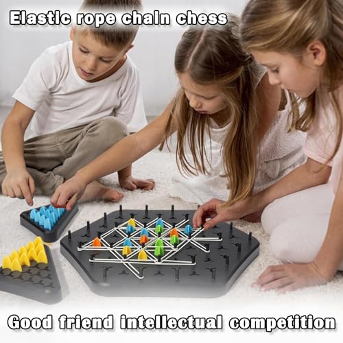 - كيف تلعب بكل الحبال الأستك التي يمكن توزيعها بالتساوي على أي لاعب لبناء مثلثات؟ يجب على كل لاعب أن يضع الأستك حول 4 أعمدة في كل دور ليصنع أكبر عدد ممكن من المثلثات. يمكنك وضع قطعة شطرنج واحدة في كل مثلث تصنعه. الفائز هو من يُنهي جميع قطع الشطرنج لديه.