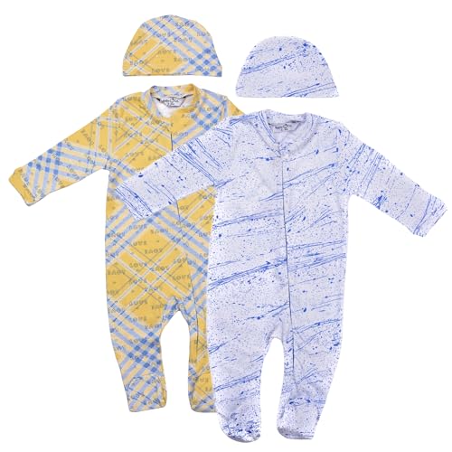 Baby Co. - سالوبيت بكباسين من القطن بتصميم أنيق ولون أصفر وأزرق مع ايس كاب (طقم من قطعتين)