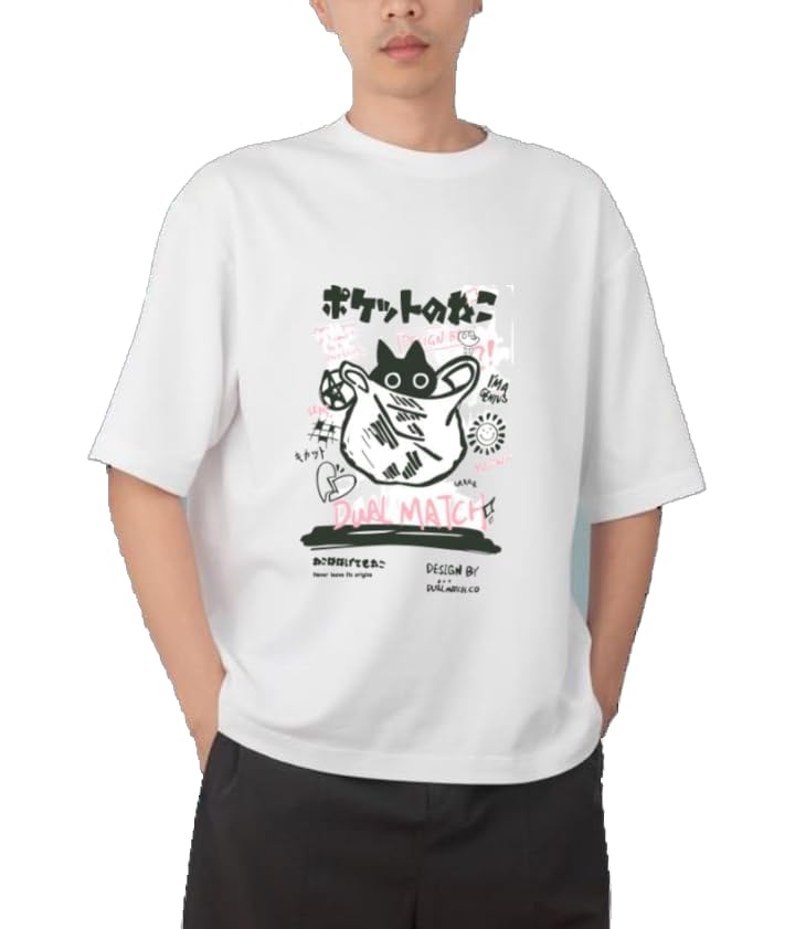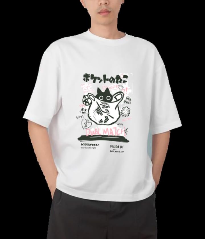 Generic - تيشرت كبير الحجم بتصميم قطة صغيرة كيتي كاواي لطيفة 0 للشباب، أسود وأبيض