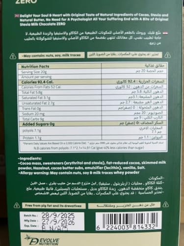 - شوكولاتة زيرو بالحليب وقطع البندق محلاه بسكر الاستيفيا صحية ومناسبة للدايت والحمية .سعرات حرارية قليلة جودة عالية