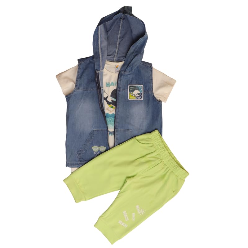 Zizo - زيزو طقم مكون من 3 قطع للاولاد مكون من بلوزة بيضاء باكمام قصيرة وسترة بغطاء راس من الدنيم مع بنطلون كابري اخضر مصنوع من قماش قطني عالي الجودة، مناسب لعمر 4 سنوات