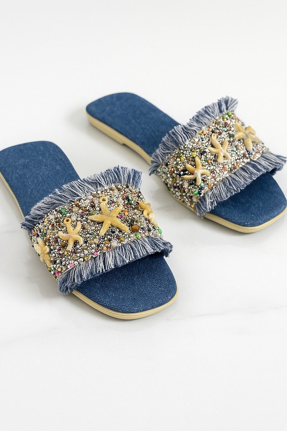 A fabric Slipper embroidered at the front with details of the beach atmosphere.SF-68-BLUE