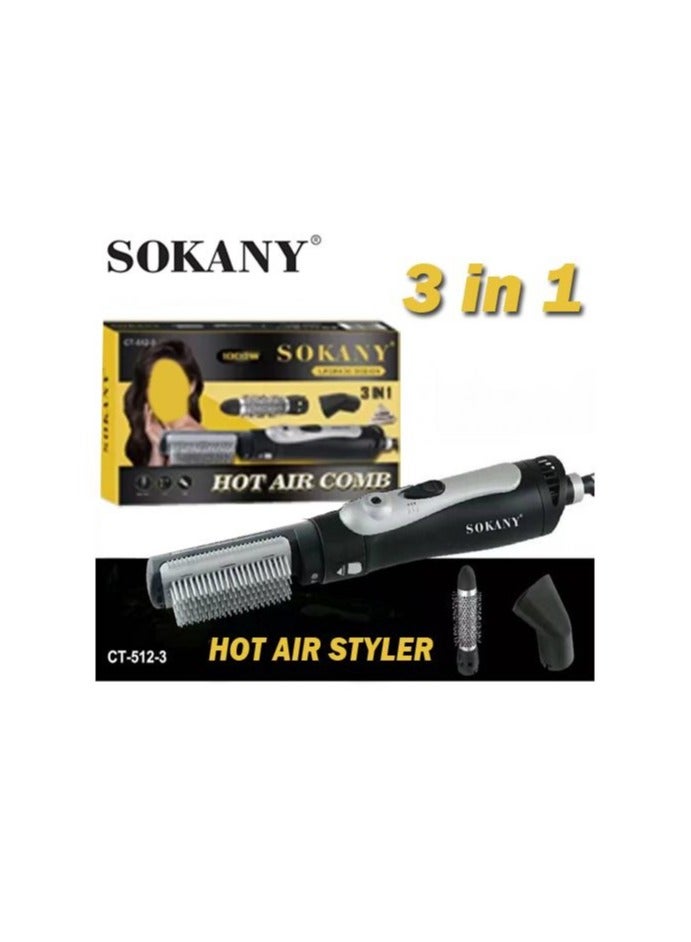 Sokany 3 in 1 Hot Air Hair Styler for Curly and Wavy Hair 3 Attachments. 3 Speed Settings. Hand Ring. 360 Degree Swivel Cord. 100 - 240V 50 - 60Hz 1000W. SK-512-3