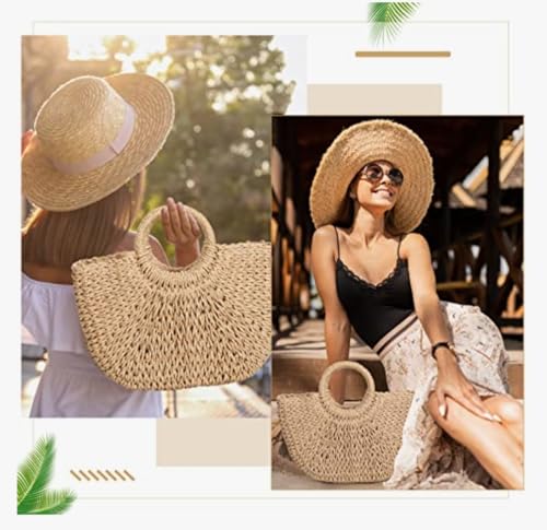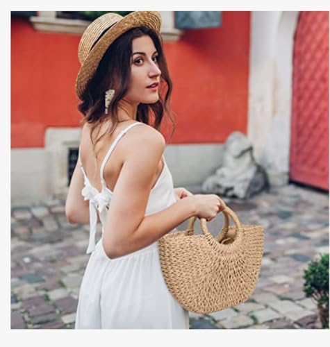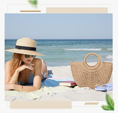 عام - حقيبة يد نسائية مصنوعة من القش، تصميم محبوك بمقبض دائري، لون بيج، للشاطئ والصيف هاند ميد