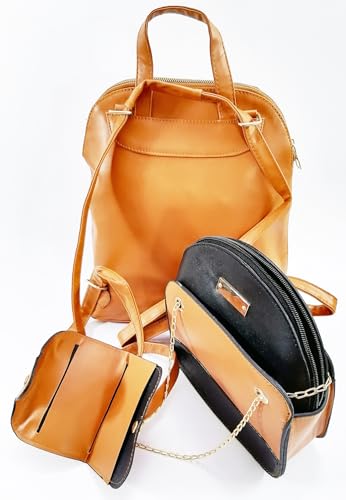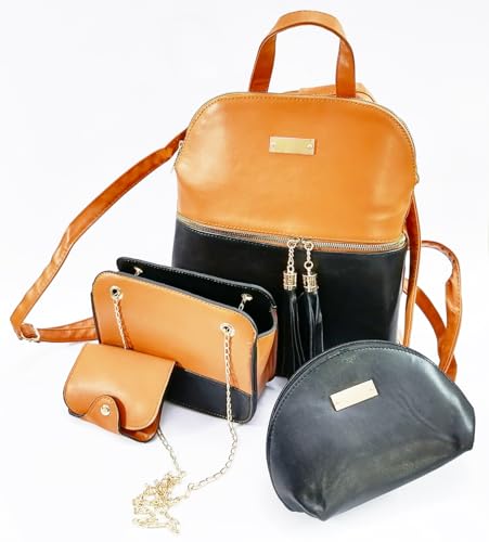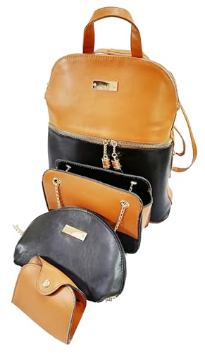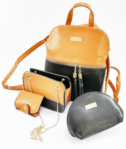 Generic - شنطة ظهر و يد حريمي وحقيبة بناتي اربع قطع لون اسود و بني جلد سميك و سوست قوية شنطة ظهر بناتي للنساء