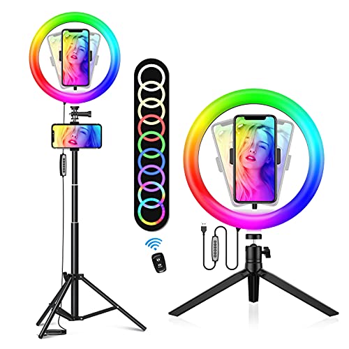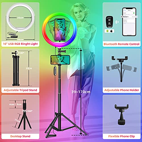 - 【Bluetooth Remote Lighting Setting】10.2'' RGB right light stand adopts Bluetooth remote control and USB wire control for you set the lighting easier. You can quickly set the brightness & CCT when taking selfies, photography, zoom meetings. Also, you can switch the different dynamic RGB lighting effects when video recording, live streaming, makeup tutorials. The included Bluetooth shutter supports IOS & Android systems, Compatible with most mobile phone models like iPhone, Samsung, Huawei, etc.