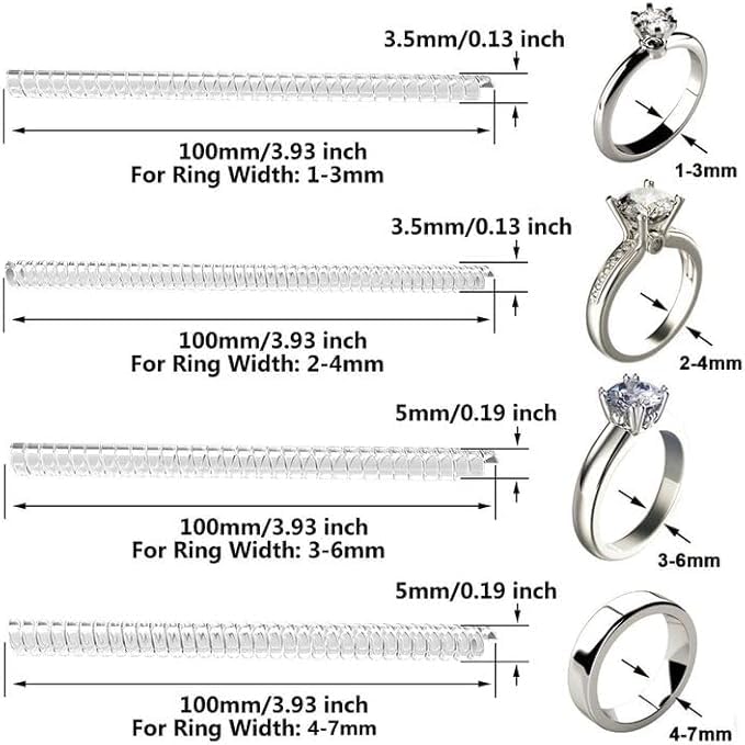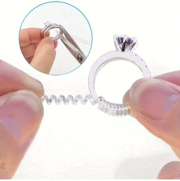 - [shape to adjust] you can cut to shape to adjust as you need,you can easily adjust the tightness by wrapping the adjustable ring sizer around the ring and trimming the excess. This silicone ring adjuster is completely transparent when you use it, no one will notice it unless you show it to others.which is reusable and durable,keeping your jewellery undamaged, completely safe.