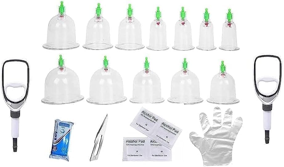 - 12 كأس حجامة (مقاسات مختلفة) - مصنوعة من مواد متينة وآمنة للبشرة.