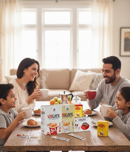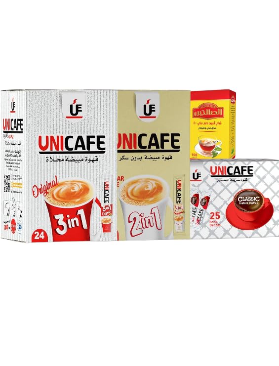 - تنوع القهوة الشامل: باقة حصرية تضم 3 أنواع مختلفة من قهوة Unicafe لتلبية كافة الأذواق: 3 في 1 مُحلاة، 2 في 1 بدون سكر، وكلاسيك سريع التحضير.