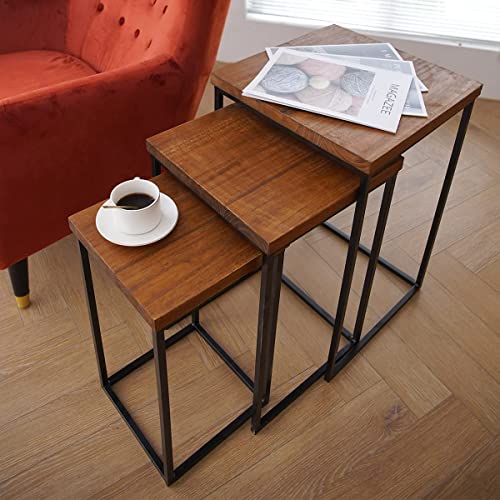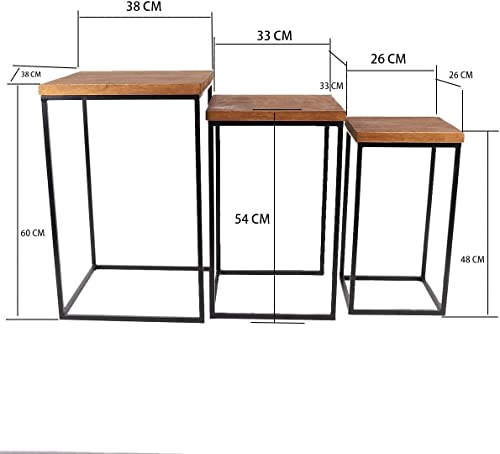 Generic - طقم طاولة متداخلة من 3 قطع، قهوة، خشبية صلبة واطار معدني، جانبية مربعة، متعدد