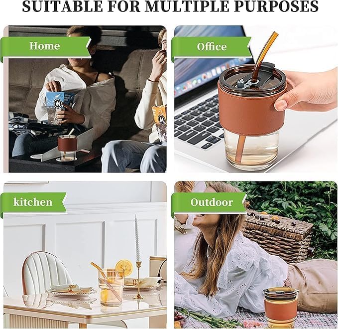 Generic - كوب زجاج مع شفاطة سيليكون وغطاء سعة 435 مل غلاف جلدي مج قهوة وفوهة للشرب المباشر باستخدام مزدوج زجاجي أساسي للسفر في الصيف متعدد الالوان