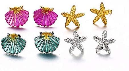 Other - 4 قطع من الأقراط شل نجم البحر - مزيج ، للأنثى، فضة مطلي- متعدد الألوان