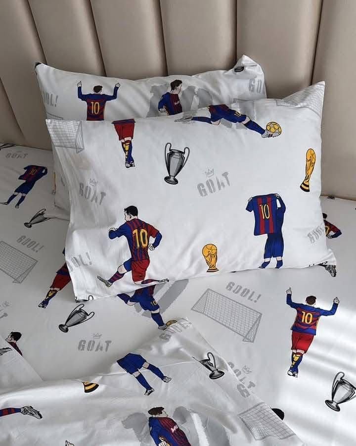 • Design: Features a signature sports print featuring a soccer player with the #10 jersey, tournament cups, and GOAT on white background