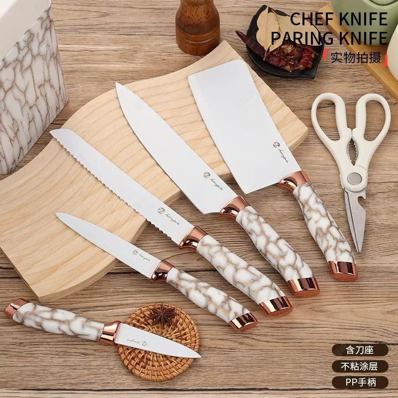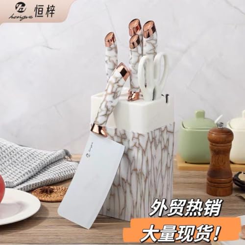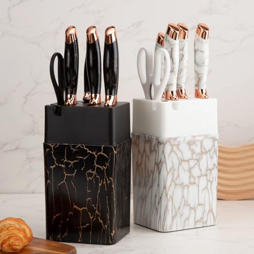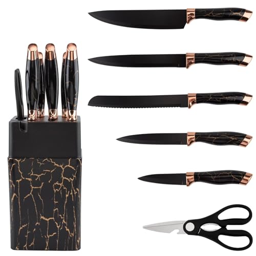 H-Home - 7-Piece Knife Set with Storage Block, Stainless Steel, Black Granite Non-Stick Coating and Ergonomic Handle (Brown)