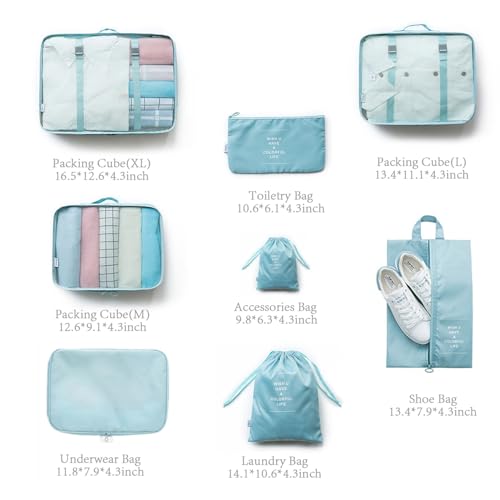 LOVCY - 8 Pieces Mesh Packing Cubes for Travel, Luggage Packing Organizers Bags Set, Travel Essentials Suitcases Accessories with Laundry Bag, Storage Shoe Bag, Clothing Underwear Bag, Blue, 8 set