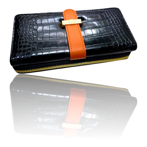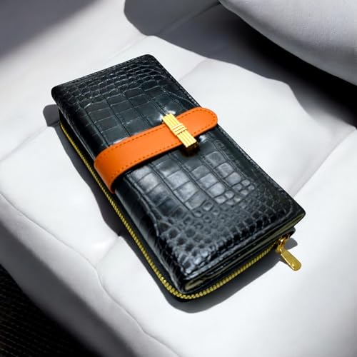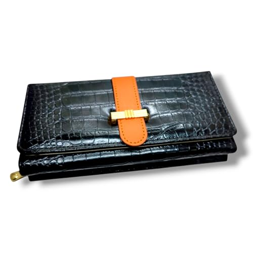 Generic - محفظة جلدية نسائية بتصميم عصري على شكل رقعة الشطرنج باللون الأسود، متعددة الأقسام مع فتحات للبطاقات ونقش التمساح