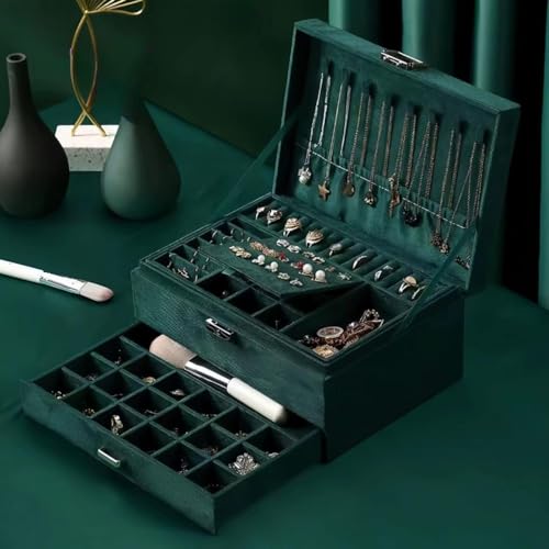 - 3-Layer Large Capacity: Our jewelry box boasts a multi-layer design for abundant storage. The first layer features 17 Rings Slots, 36 Earrings Studs Hooks, Big Watches Case, 20 Earrings Display Hooks, and 9 Hidden Rings Slots. The second layer holds 6 Removable Watch Slots. The third layer showcases a drawer-type design that accommodates an 18 Big Rings Case and a Cosmetic Brush Slot.