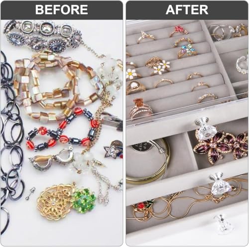 - * منظم حامل أقراط شفاف: يحافظ صندوق المجوهرات الشفاف هذا على مجوهراتك المفضلة خالية من الغبار ويمنحك رؤية خالية من العوائق للجزء الداخلي من الجزء العلوي من الصندوق، مما يبسط عملية اختيار المجوهرات ويجعل من السهل تتبع مكان تخزين كل قطعة. أصبحت حوامل الخواتم المصممة بشكل لا تشوبه شائبة ديكورًا للغرفة