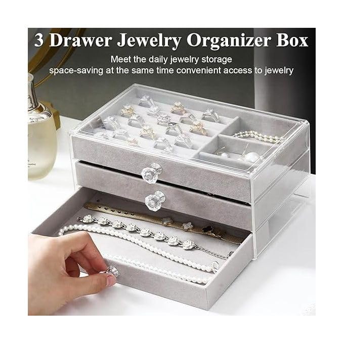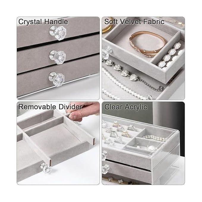 - * صندوق مجوهرات من الأكريليك: صندوق المجوهرات هذا المصنوع من الأكريليك ليس من السهل كسره، مكون من 3 ادراج قطيفة مقسمين بطريقة تناسب اكسسواراتك للحفاظ عليها منظمة، يحافظ دائمًا على المجوهرات مشرقة ومبهرة، لأن صندوق المجوهرات بأكمله يضيف لمسة من النكهة العصرية، وأكثر من ذلك بحيث تتوهج خزانة ملابسك أو طاولة المكياج بنوع مختلف من اللمعان