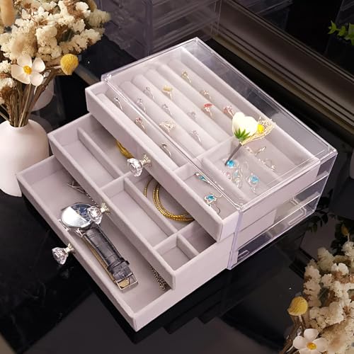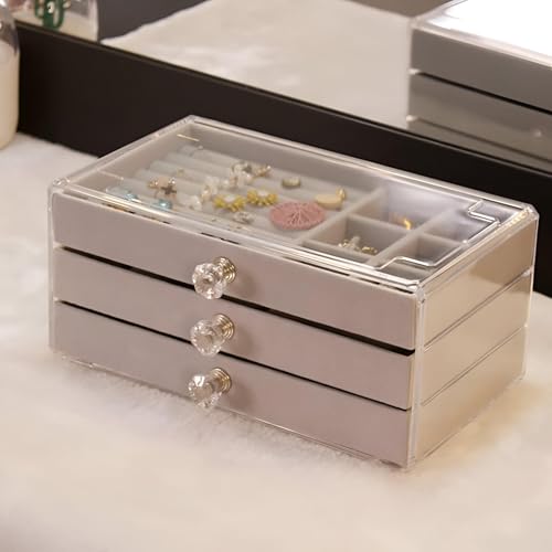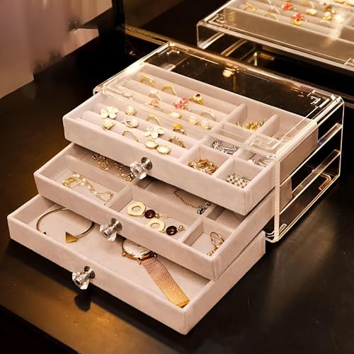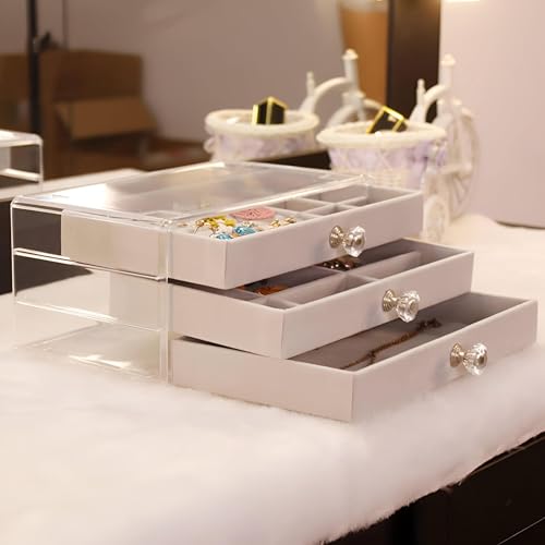 Generic - منظم اكريليك أنيق بثلاثة أدراج مبطنة بالقطيفة مزود بمقابض كريستال وأقسام مقسمة لتخزين المجوهرات واكسسوارات الشعر والمزيد بسعة تخزين كبيرة وتصميم راقي
