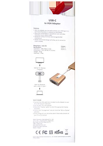 • Easily connect your USB Type-C 3.1 port based MacBook or notebook to VGA display