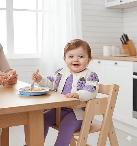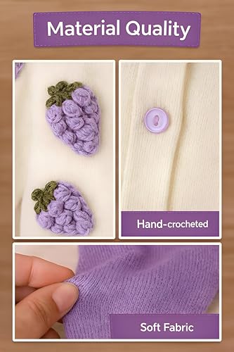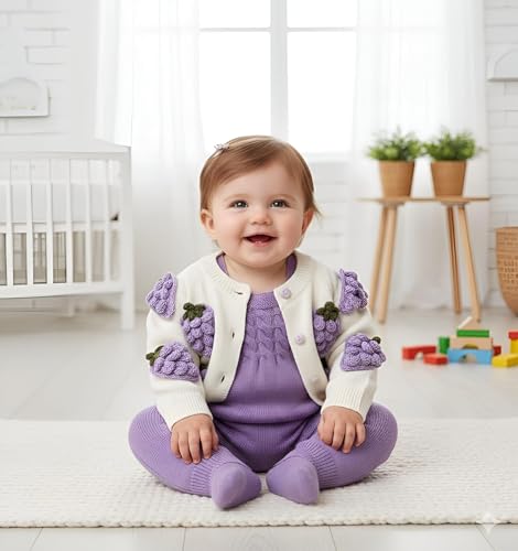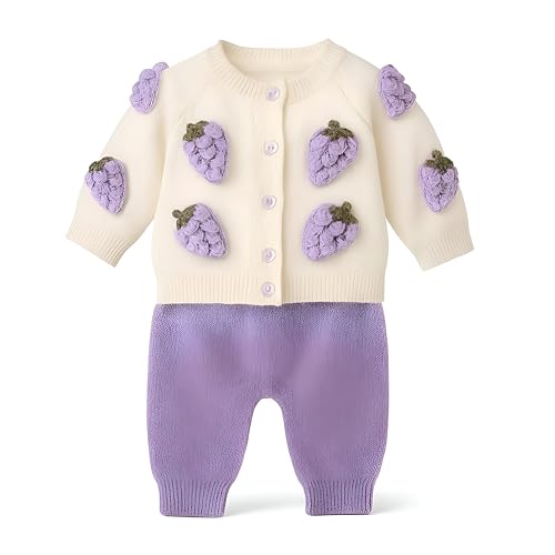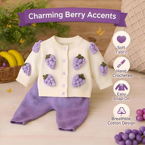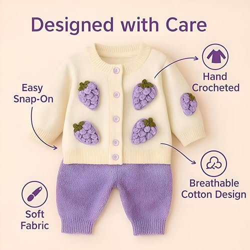 Generic - Baby Knit Cardigan and Pants Set - Cream and Purple Hand Crocheted Berry Accents, Soft Cotton, Button-Front for Comfortable & Stylish Newborn Wear